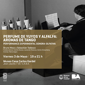 Bruno Mesz and Sebastián Tedesco achieved the experimental sound-olfactory performance Perfume of Yuyos and Alfalfa: Tango Aromas at the Museo Casa Carlos Gardel. It was carried out in collaboration with Camilo Álvarez, Leonardo Potenza, María Zegna and Carlos Sztaynberg; and is part of the Smell organ project developed within the MUNTREF Center for Art and Science.